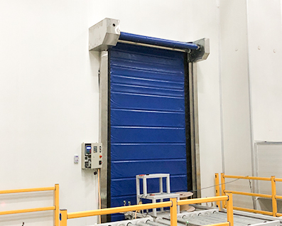 上图为智能立体冷链物流冷藏库传送线上安装的双轴保温快速卷帘门